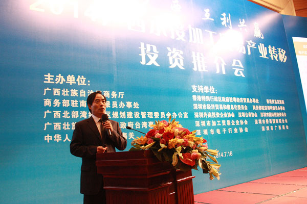 2014年7月16日,由自治區(qū)商務(wù)廳主辦的2014廣西承接加工貿(mào)易產(chǎn)業(yè)轉(zhuǎn)移投資推介會在深圳舉行。自治區(qū)政府副秘書長魏然,深圳市經(jīng)濟(jì)貿(mào)易和信息化委員會副主任高林等領(lǐng)導(dǎo)和嘉賓為會議致辭。自治區(qū)商務(wù)廳、北部灣辦分別從不同角度對廣西承接加工貿(mào)易產(chǎn)業(yè)轉(zhuǎn)移投資環(huán)境進(jìn)行了推介。北海、欽州、梧州、南寧四個國家級加工貿(mào)易梯度轉(zhuǎn)移重點(diǎn)承接地,欽州保稅港區(qū)、憑祥綜合保稅區(qū)、北海出口加工區(qū)、中馬欽州產(chǎn)業(yè)園、東興國家重點(diǎn)開發(fā)開放試驗(yàn)區(qū)、南寧高新技術(shù)產(chǎn)業(yè)開發(fā)區(qū)、中國電子北海產(chǎn)業(yè)園、梧州市粵桂合作特別實(shí)驗(yàn)區(qū)八個重點(diǎn)園區(qū),分別就各自的產(chǎn)業(yè)布局、投資環(huán)境、政策優(yōu)勢進(jìn)行了推介。香港特區(qū)政府駐粵辦、香港貿(mào)易發(fā)展局、深圳外商投資企業(yè)協(xié)會、深圳臺商協(xié)會、深圳市加工貿(mào)易企業(yè)協(xié)會、深圳市企業(yè)聯(lián)合會、深圳市電子行業(yè)協(xié)會及廣東各類加工貿(mào)易企業(yè)約400人出席了推介會。