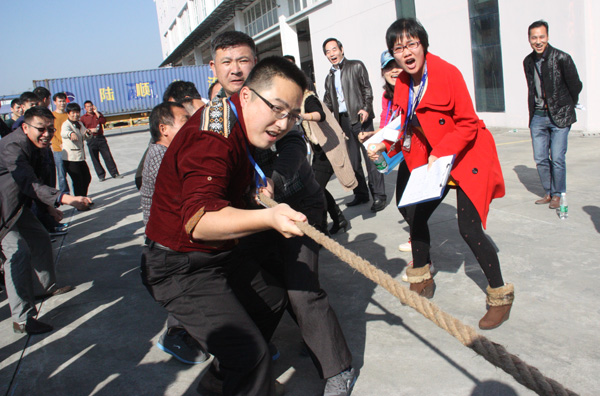 下午,一場別開生面的拔河比賽將活動(dòng)推向小高潮。拔河比賽以促進(jìn)企業(yè)交流為宗旨,豐富職工體育活動(dòng)為目的,為企業(yè)搭建展現(xiàn)集體風(fēng)采的舞臺(tái),從而發(fā)揚(yáng)團(tuán)隊(duì)精神,增強(qiáng)凝聚力。此次比賽園區(qū)企業(yè)積極響應(yīng),共有11個(gè)企業(yè)組隊(duì)參加,特別是有些企業(yè)為了參賽,臨時(shí)停工,比賽結(jié)束后回單位繼續(xù)生產(chǎn),體現(xiàn)了園區(qū)大家庭的凝聚力。每支參賽隊(duì)伍共15人,其中男生10人,女生5人,實(shí)行淘汰制晉級(jí)方式。當(dāng)比賽哨聲響起,各參賽隊(duì)員們口中一起高呼“一二,一二”,雙手緊握長繩,憋足勁拼命往后拉,拉拉隊(duì)在旁助陣加油,恨不得抓起繩子跟隊(duì)員們一起努力,各種加油聲、吶喊聲此起彼伏,回響至整個(gè)園區(qū)。經(jīng)過激烈較量,最終冠捷科技獲得冠軍,瑞達(dá)物業(yè)獲得亞軍。