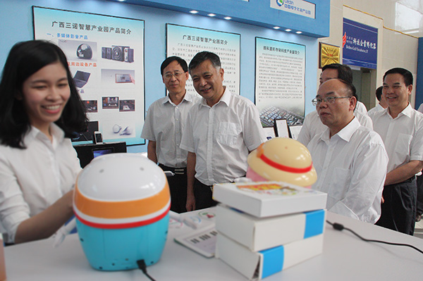在園區(qū)展示廳,于春生聽(tīng)取了北海工業(yè)園區(qū)管委會(huì)主任朱會(huì)東對(duì)北海市打造千億元電子信息產(chǎn)業(yè)規(guī)劃,中國(guó)電子北海產(chǎn)業(yè)園發(fā)展進(jìn)程匯報(bào)以及下一步以信息服務(wù)業(yè)為主導(dǎo),以智能硬件和創(chuàng)意設(shè)計(jì)為重要支撐產(chǎn)業(yè),政企聯(lián)合共建中國(guó)電子北部灣信息港的規(guī)劃介紹,陪同參觀了園區(qū)長(zhǎng)城能源、冠捷科技、三諾電子等企業(yè)產(chǎn)品。在園區(qū)企業(yè)三諾電子產(chǎn)品體驗(yàn)區(qū),饒有興趣的聽(tīng)取了工作人員對(duì)新穎的數(shù)碼音響產(chǎn)品演示及介紹。在創(chuàng)業(yè)成果展示區(qū),于春生觀看了園區(qū)管委會(huì)、科技局、產(chǎn)業(yè)園三方合作共建的北部灣孵化器創(chuàng)業(yè)企業(yè)科遙奇智能機(jī)械手演示,聽(tīng)取了蘊(yùn)芯科技電子芯片產(chǎn)品專利技術(shù)介紹、產(chǎn)品銷售及推廣,了解了會(huì)圈紅包的互聯(lián)網(wǎng)+營(yíng)銷模式,鼓勵(lì)創(chuàng)業(yè)青年以市場(chǎng)為導(dǎo)向,結(jié)合自有特色,抓住產(chǎn)業(yè)發(fā)展機(jī)遇做大做強(qiáng)。當(dāng)于春生得知科遙奇、海云智慧等好幾家創(chuàng)業(yè)企業(yè)在國(guó)家、自治區(qū)一級(jí)創(chuàng)業(yè)大賽上榮獲嘉獎(jiǎng),蘊(yùn)芯科技、瀟鳴進(jìn)出口貿(mào)易等企業(yè)產(chǎn)品訂單源源不斷暢銷國(guó)內(nèi)外市場(chǎng)時(shí),于春生對(duì)園區(qū)發(fā)展電子信息制造業(yè)的同時(shí),重視中小微企業(yè)創(chuàng)業(yè)創(chuàng)新,并取得積極成效給予充分肯定,對(duì)中國(guó)電子發(fā)揮電子信息國(guó)家隊(duì)帶動(dòng)作用,引領(lǐng)龍頭企業(yè)集聚北海,實(shí)現(xiàn)了北海電子信息產(chǎn)業(yè)量與質(zhì)的飛躍,對(duì)地方產(chǎn)業(yè)結(jié)構(gòu)調(diào)整中的貢獻(xiàn)給予充分肯定,稱贊了園區(qū)良好的發(fā)展環(huán)境。臨行前,于春生囑咐園區(qū)繼續(xù)加強(qiáng)陽(yáng)光工程建設(shè),以務(wù)實(shí)的工作作風(fēng),嚴(yán)明紀(jì)律,打造一個(gè)陽(yáng)光、優(yōu)質(zhì)的千億元電子信息產(chǎn)業(yè)基地。
