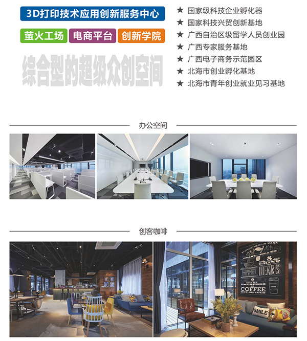 中電北海產(chǎn)業(yè)園眾創(chuàng)空間規(guī)劃面積5000平方米,重點圍繞智慧城市、智能硬件、物聯(lián)網(wǎng)、移動互聯(lián)網(wǎng)、大數(shù)據(jù)、電子商務(wù)等重點新型產(chǎn)業(yè)領(lǐng)域,采取互聯(lián)網(wǎng)+現(xiàn)場服務(wù)的模式,整合上下游資源,為入住企業(yè)和創(chuàng)業(yè)者提供政策咨詢、科研支持、人才引進、電商培訓(xùn)、創(chuàng)業(yè)指導(dǎo)、融資對接等服務(wù),形成支持創(chuàng)新創(chuàng)業(yè)的生態(tài)圈。中電北海產(chǎn)業(yè)園眾創(chuàng)空間通過整合各方資源,已經(jīng)集成一批面向區(qū)域主導(dǎo)產(chǎn)業(yè)的前沿技術(shù),整合了戰(zhàn)略投資基金、天使基金和社會投資相結(jié)合的創(chuàng)新創(chuàng)業(yè)投資基金,建立了涵蓋科學(xué)家、創(chuàng)業(yè)企業(yè)家和企業(yè)運營管理專家的創(chuàng)業(yè)導(dǎo)師團隊,聚集電商平臺、3D打印技術(shù)應(yīng)用創(chuàng)新服務(wù)中心、創(chuàng)新學(xué)院、螢火工場實驗室等一體化服務(wù)機構(gòu)構(gòu)成綜合型的超級眾創(chuàng)空間。